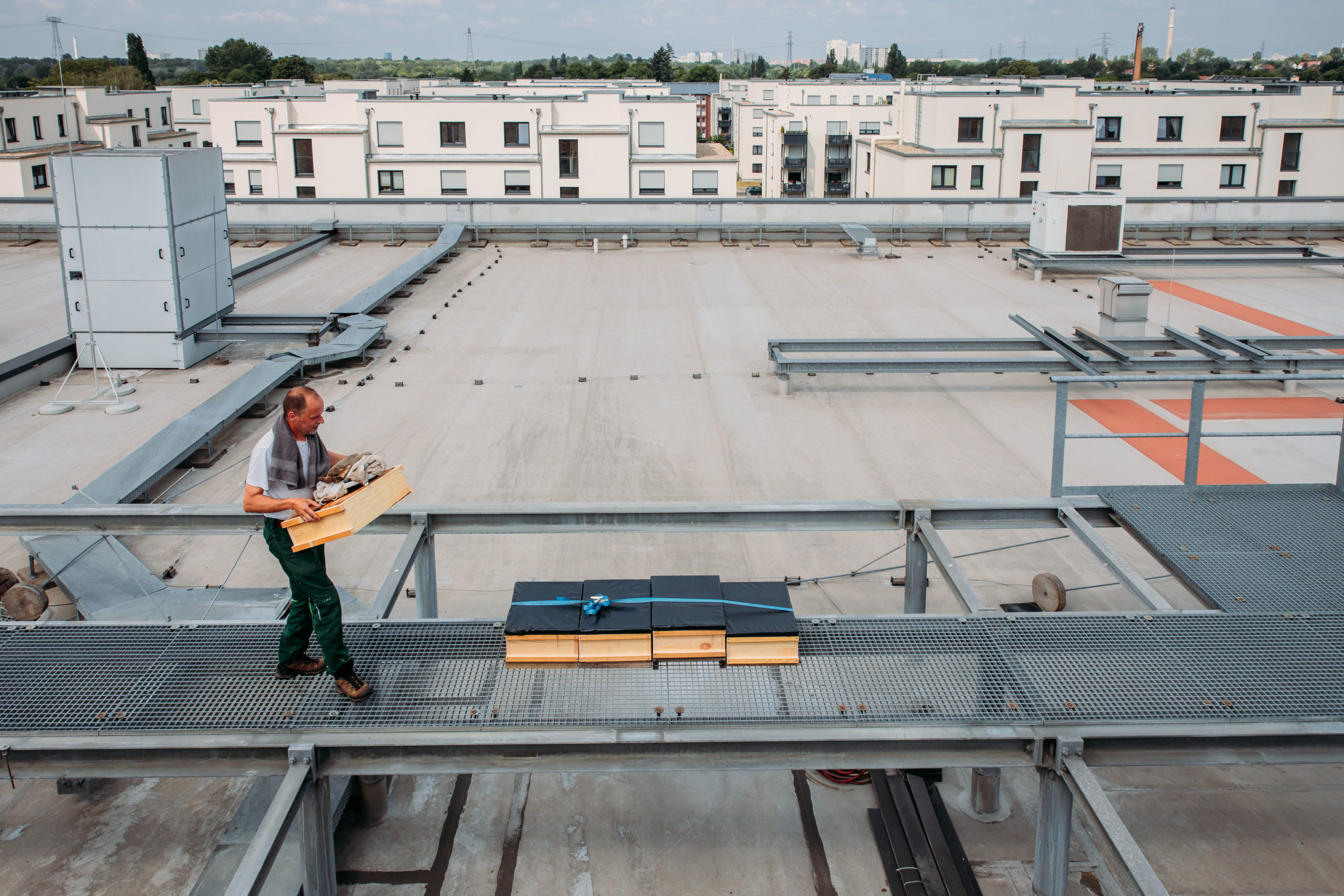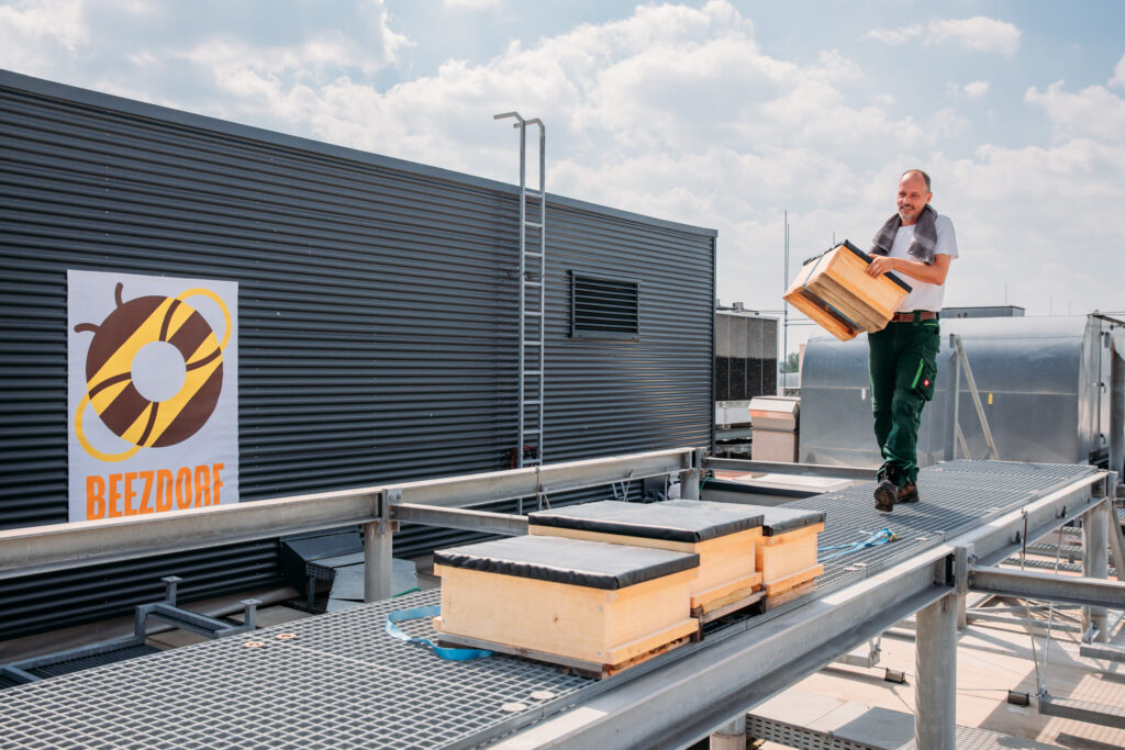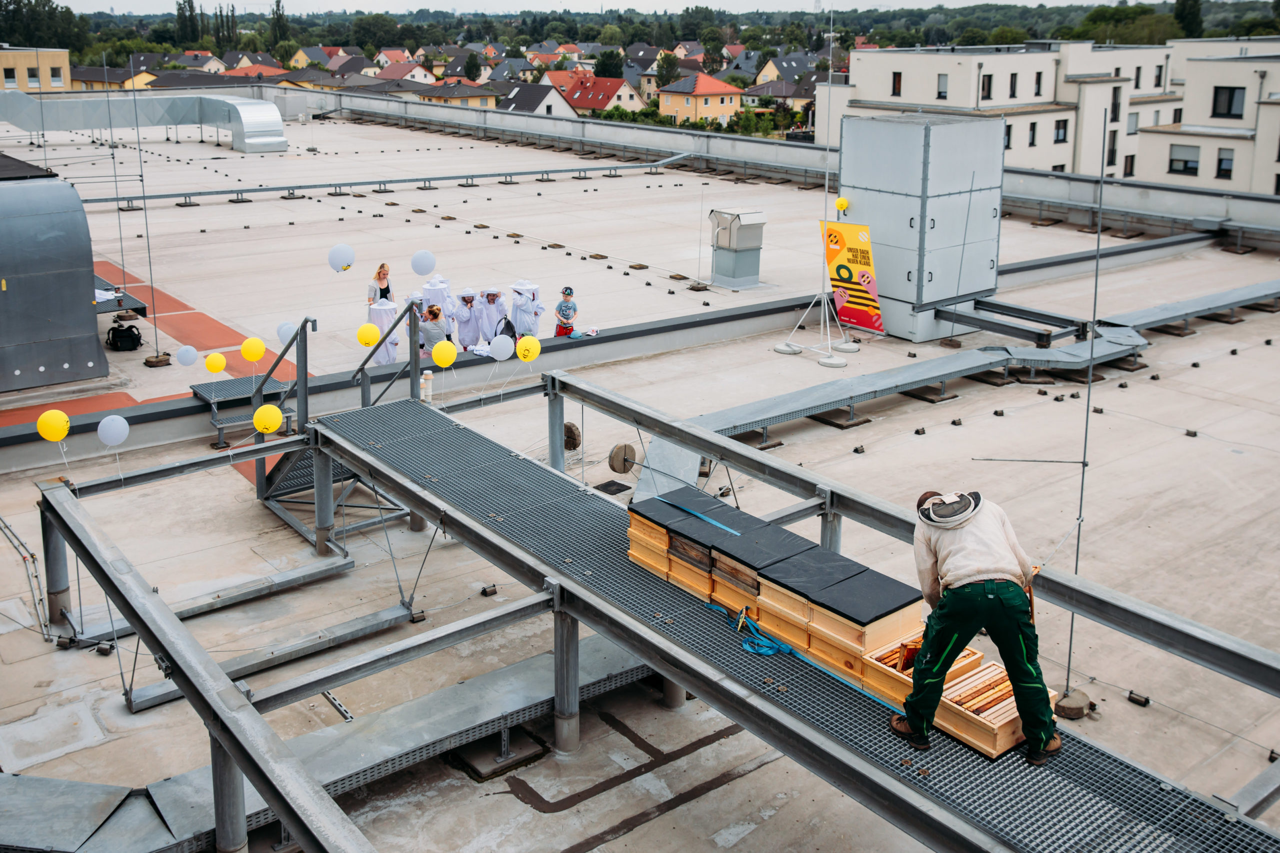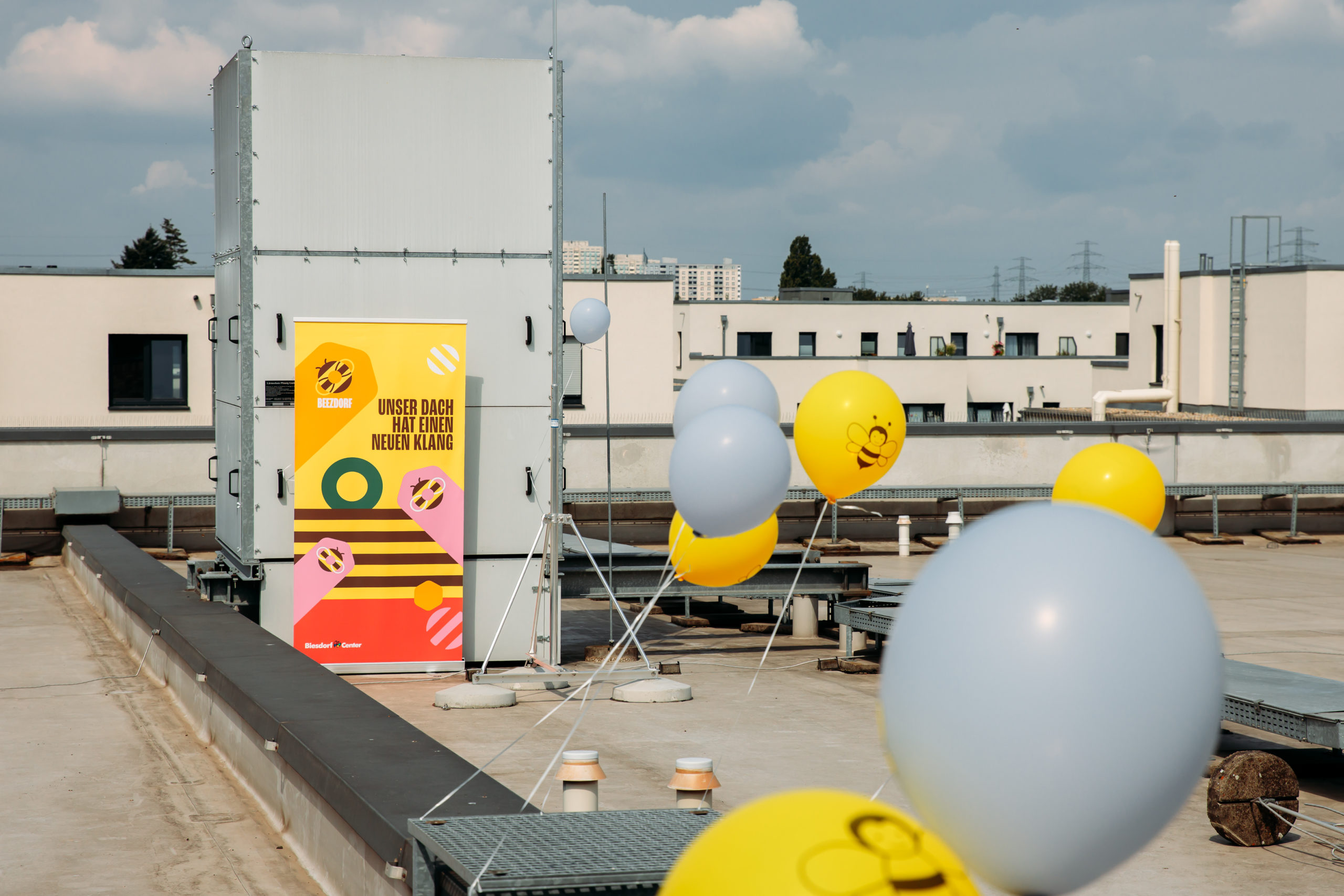 Für das Beezdorf-Projekt wurden insgesamt 6 Bienenvölker auf dem Dach des Biesdorf Centers aufgestellt. Die Honigbienen werden von geschulten Imkern betreut und sind in der Umgebung auf Futtersuche. Mit dem Projekt unterstützen wir nicht nur die Bienen, sondern die gesamte lokale Biodiversität und Artenvielfalt in einem Radius von bis zu fünf Kilometern um das Center.